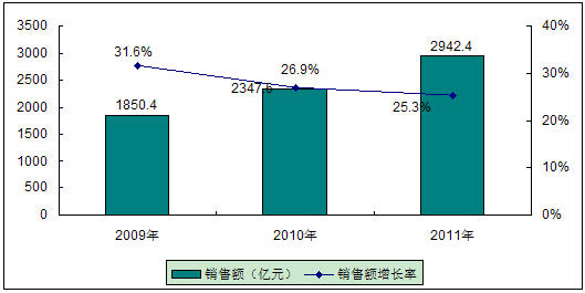 圖3 2009-2011年中國汽車電子市場規模與增長預測