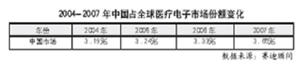 對比中國與全球醫療電子市場增長情況,近4年中國市場增長率持續高于全球市場增長水平,且中國占全球市場份額也正穩步提升,2007年達到3.65%。我國對醫療電子產品需求的增長直接推動了醫療電子產品市場規模的擴大。