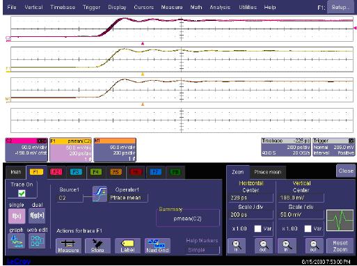 這張圖片說明了在WaveMaster示波器中怎樣測試SinX內插的有效性。在這種情況下,它把重復的信號應用到通道2,啟動余輝,使SinX內插失效。F1定義為通道2的余輝曲線中間值。隨著時間推移,余輝曲線被填充,Ptrace中間值函數生成輸入模擬波形的清楚圖片。F1保存到存儲器M1中,成為參考曲線。