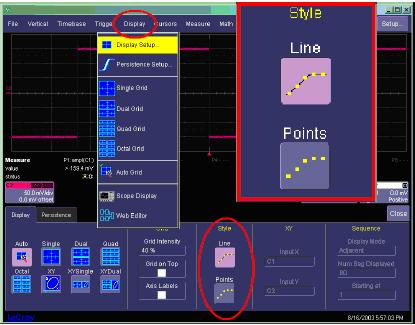 顯示畫面可以設置成只顯示點或直線。在選擇點時,將只顯示波形點,包括任何內插的點。在選擇直線時,會在每個波形點之間畫一條直線,僅包括顯示畫面上內插的點。