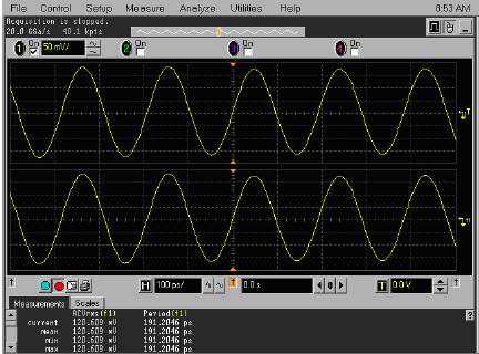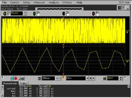 安捷倫允許關閉或打開SinX內插,允許在顯示模式中使用點或直線。與泰克一樣,安捷倫的判斷基于是否內插時基設置,在低于500 ps/div的時間/格設置時內插最多16個額外的點,在高于50 ns/div時不內插額外的點。如果顯示樣式選擇直線,那么將在各點之間劃直線,甚至包括內插的點。這與力科實現方案類似,但這些直線也出現在余輝曲線中,力科從不會把直線放在余輝曲線中。