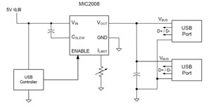 圖7是一種輸出限制電流可調(diào)節(jié)的USB端口電路。該電路由MIC2008作功率分配開關(guān),由USB控制器對功率分配開關(guān)實(shí)現(xiàn)控制。限定的電流由外設(shè)電阻R來設(shè)定(限制電流范圍為0.2~2.0A)。該功率分配開關(guān)的輸出電壓上升率(啟動(dòng)時(shí)間)可由外設(shè)電容C來設(shè)定,內(nèi)部有過熱保護(hù)及輸入電壓過低時(shí)輸出鎖存保護(hù)。