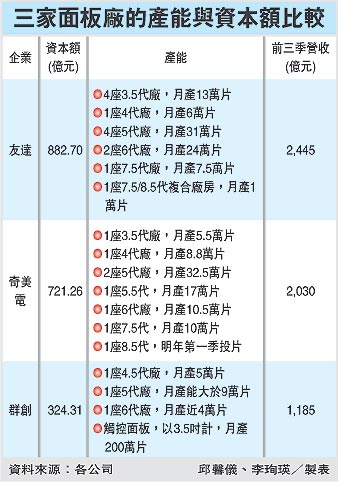 臺灣三家面板廠產能與資本額比較