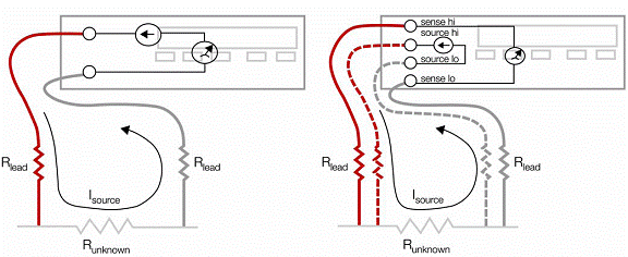 圖2(右).4線電阻測量消除了電壓引線中的電流,消滅了這一誤差來源。