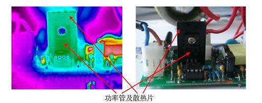大的器件,所以必須加裝散熱片使其長期穩(wěn)定工作溫度不超過120℃;在拍攝熱圖時,散熱片是鋁合金材料經(jīng)過發(fā)黑處理,其表面雖然為黑色但其發(fā)射率還是較低,建議用油漆筆涂黑后進行檢測,或在溫度穩(wěn)定一段時間后直接測量功率管的溫度。