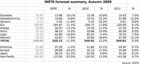 象其它市場分析機(jī)構(gòu)一樣,WSTS已作出今年的秋季最新預(yù)測,認(rèn)為2009年全球半導(dǎo)體業(yè)將下降11%,而在6月時(shí)曾預(yù)測下降大于20%。其中美國的數(shù)據(jù)尤為突出,其09年僅下降1%,而6月時(shí)預(yù)測下降15%。由此WSTS堅(jiān)信工業(yè)已經(jīng)觸底,未來推動(dòng)正的增長。
