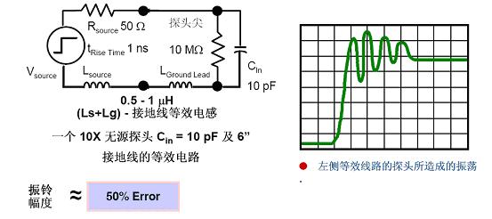 探頭接地引線實質可以等效為電感效應,接地引線電感與探頭及示波器的輸入電容形成串聯諧振電路。而探頭的輸入電阻則在諧振電路中引入阻尼。電感效應會造成阻抗不匹配,而且是帶寬越大影響就越大。等效電感的大小與接地線長度有關,其越長電感效應就越大,對波形的破壞效應就是會產生脈沖信號的振蕩、過沖等信號完整性問題帶有接地引線電感的示波器探頭等效電路及效應如下圖4。