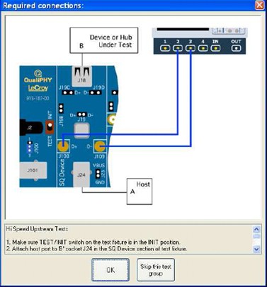 QualiPHY軟件的用戶界面設計非常人性化和直觀實用,它會以圖表化的方式顯示出一致性測試的每個環(huán)節(jié)中測試夾具、示波器主機和DUT三者之間的拓撲關系,使用者無需記憶,就能正確設置測試環(huán)境。下圖4清晰 顯示了USB2.0高速設備信號質(zhì)量測試中的夾具、DUT和示波器連接關系。
