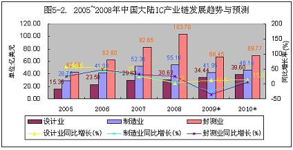 據(jù)中國半導(dǎo)體行業(yè)協(xié)會(huì)統(tǒng)計(jì),今年1~9月份IC設(shè)計(jì)業(yè)、制造業(yè)和封裝業(yè)的銷售收入分別比2008年增長10.2%、-25.4%和-37.2%,制造業(yè)和封裝業(yè)下降幅度較大。預(yù)計(jì)2010年會(huì)隨著國內(nèi)經(jīng)濟(jì)和出口形勢(shì)的好轉(zhuǎn),將逐步回升到小幅度正增長(見圖5-1、5-2)。