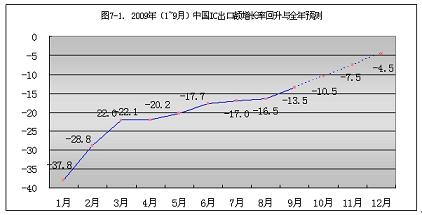2009年1~9月份,中國大陸IC出口額的增長率從元月份的-37.8%,回升到9月份的-13.5%。回升了24.3個(gè)百分點(diǎn)。按此回升速度計(jì)算,到今年年底,可回升到-4.5%(見圖7-1)。
