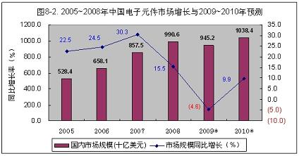 2009年,國內(nèi)電子組件市場(chǎng)需求規(guī)模,同2008年相比將下降4.6%,約為945.2億美元(見圖8-2)。其中,60%左右仍靠進(jìn)口。