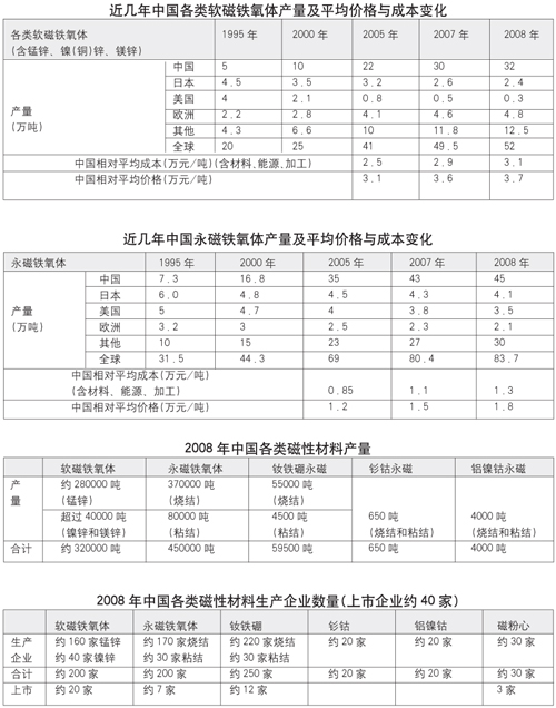 中國磁性材料產(chǎn)量以15%以上的年增長率發(fā)展,到2008年,中國軟磁鐵氧體產(chǎn)量已達32萬噸,永磁鐵氧體45萬噸,燒結(jié)釹鐵硼永磁5萬噸,粘結(jié)釹鐵硼永磁0.45萬噸,釤鈷永磁0.65萬噸,鋁鎳鈷永磁0.4萬噸。