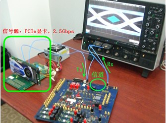 對比分析的工作環境如圖2所示:信號源為某PCIe顯卡發送的2.5Gbps的信號,信道為某DEMO板上24英寸長的傳輸線,接收端為兩個50歐的電阻。分別在三種情況下進行分析: