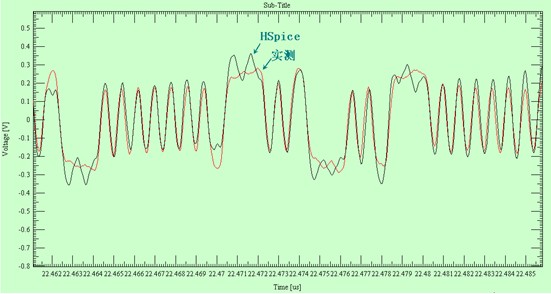 在圖9中分別為fbase=30/40/50MHz時,HSPICE仿真出的接收端波形。可以看到fbase=50MHz時,低頻的碼型(長1或長0)幅度較低些,與實測RX端波形的比較接近。在使用HSPICE仿真時,fbase=50MHz時的仿真時間遠小于最開始的頻率設置(fbase = 10MHz)。在圖10中,對比了fbase=50MHz時HSPICE仿真的RX端波形與實測波形,兩者一致性比較好。