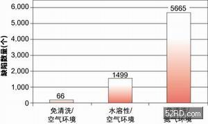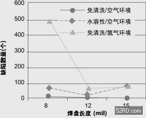 圖1顯示出三種不同組裝工藝的良品率情況。由圖可見,使用免清洗焊膏在空氣環境下進行回流焊產生的不良最少,總數為66個;使用水溶性焊膏在空氣環境下進行回流焊次之,不良有1,499個;使用免清洗型焊膏在充氮環境下進行回流焊產生的不良數最多,為5,665個。圖3還表明在充氮環境下以及焊膏助焊成分活性增大(水溶性焊膏)時,產生的不良數目會增多。