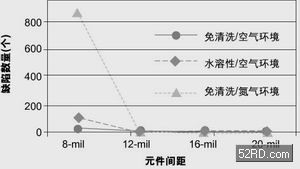 圖2是三種不同組裝工藝中錫橋與元件間隔之間的關系。從圖中看出,元件間隔在0.012英寸或更大時沒有發生任何錫橋。免清洗焊膏在空氣環境中焊接產生的錫橋數量最少,為14個;水溶性焊膏在空氣環境中焊接產生的橋接數量排在第二,為99個;而免清洗焊膏在充氮環境中焊接產生的橋接數量最多,有866個。此外在最小的0.008英寸間距下,用免清洗焊膏在空氣環境焊接時18種焊盤中有12種焊盤沒有產生任何錫橋,用水溶性焊膏在空氣環境中焊接時有10種焊盤沒有錫橋,而使用免清洗焊膏在充氮環境中焊接時只有6種焊盤沒有產生錫橋。