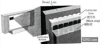 (圖一)是典型MD方式(MicroDisplay;它是指DLP、HTPS與LCOS等微型成像元件構成的投影光機引擎而言)RP-TV用螢幕的構造,如圖一所示從背面投射的影像光線,通過FresnelLens之后收斂成平行光再入射至螢幕,由于RP-TV用螢幕設有珠粒狀鏡片陣列,所以又稱為珠粒狀螢幕(LenticularScreen)。
