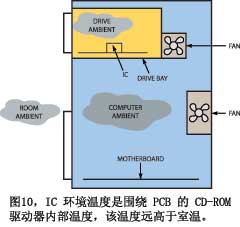 無疑,當大多數(shù)工程師沒有理解環(huán)境溫度的嵌套程度時,他們就會失敗。例如,假設(shè)要設(shè)計一個部件,用于CD播放機的光學(xué)拾取裝置(圖10)。你可能會這么假設(shè),由于該部件用于消費產(chǎn)品,它可能工作在0℃~70℃。但好好想想吧。實驗室工作臺上的部件可能是工作在25℃環(huán)境下。而光功率件是要安裝在CD驅(qū)動器里,驅(qū)動器中有其它元件在加熱空氣,該裝置可能不裝風扇。更糟糕的是,播放機裝在計算機內(nèi),驅(qū)動器必須工作在這種環(huán)境溫度下。計算機內(nèi)部有自己的熱源和風扇,這個溫度上再加上外部環(huán)境溫度,因此,在工作臺上測得的25℃室溫,到了計算機內(nèi)就是40℃,CD驅(qū)動器內(nèi)是50℃。現(xiàn)在,如果你把計算機放在厄瓜多爾的一個很熱的閣樓上,情況又該如何?這個部件必須工作在遠高于70℃的環(huán)境溫度下。你的職責是確保它仍能滿足規(guī)范,并且高溫不會顯著縮短產(chǎn)品的壽命。