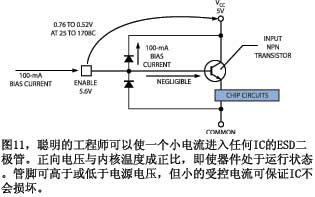 即使當器件在電路中工作時,許多聰明的半導(dǎo)體制造商都會自己測量內(nèi)核本身溫度,他們用的是一片IC的每個輸入、輸出和控制腳上都有的ESD(靜電放電)二極管(圖11)。你可以將這種方法用于有復(fù)位或CS(片選)腳的IC,也可以用多個其它腳作測量。由于二極管的正向壓降與電流成正比,你可以將芯片放入烤箱,使小電流通過ESD二極管。業(yè)內(nèi)很多人認為,100mA的電流不會造成二極管的任何自熱現(xiàn)象。你不需要為部件加電來測量二極管電壓,你可以用電源腳上或接地腳下的任何輸入或輸出腳。管腳內(nèi)部的ESD二極管會將該腳箝位在大約0.6V。如果是復(fù)位腳,它需要在部件工作時保持高電平,則將該腳上拉到電源腳。當烤箱溫度上升時,ESD二極管的正向壓降從大約0.7V降到0.53V。