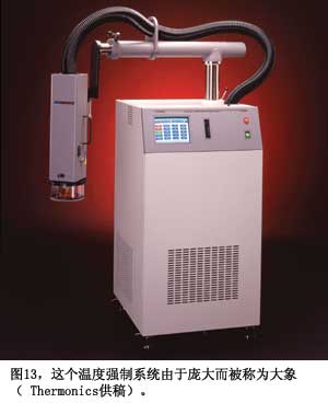 做測量只是檢查真實情況,驗證自己的假設(shè)與估算的一個部分。如果沒有可用的環(huán)境溫度,你還必須自己創(chuàng)造出來。汽車公司會在亞利桑那州和加拿大做跟蹤測試,對于電子測試,采用臺面測試室或溫度強制系統(tǒng),如Thermonics的T-2500E型(圖13)。要確保使用的電纜和測試線可以承受熱量。BrownBNC電纜有較高的額定溫度,優(yōu)于更常用的黑色U58型線(參考文獻9)。熱風槍的快速氣流就可以加熱IC,但要小心,IC可能很容易被熱風槍毀壞。制