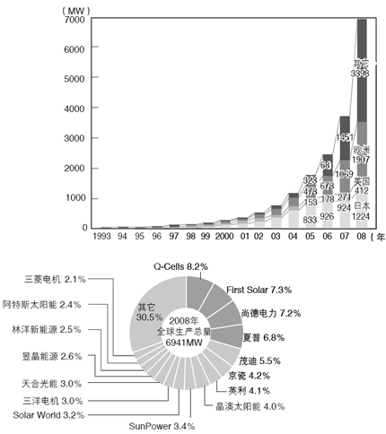 - 全球太陽電池產量急增, 2008年比上年大幅成長了87%,達到6941MW