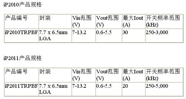 iP2010的輸入電壓范圍為7V至13.2V,輸出電壓范圍則為0.6V至5.5V,輸出電流高達30A。這個器件最高運行頻率為3MHz。在5MHz運行時,與iP2010引腳兼容的iP2011備有相同的輸入和輸出電壓范圍,但后者經過優化,從而使最高輸出電流高達20A。通過以通用占位面積提供多種電流額定值器件,IR提供的靈活性能夠滿足不同客戶對電流水平、性能和成本的要求。