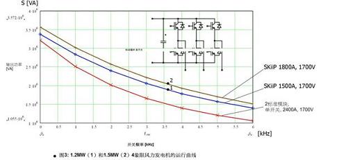 兩個(gè)單管模塊將提供一個(gè)2.4kA的半橋。比較計(jì)算的結(jié)果可以看到,與放置在最大外殼中的標(biāo)準(zhǔn)模塊相比,采用SKiiP的方案可在整個(gè)開關(guān)頻率范圍內(nèi)提供更高的輸出電流。可用逆變器輸出功率與開關(guān)頻率的關(guān)系見圖3。