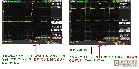 由此看來,在存儲深度一定的情況下,采樣率越高,采樣時間就越短。隨著信號的日益復雜,想要完整地呈現信號的全貌或是信號間的相對關系,單憑高采樣率無法實現,還需要長時間的采樣捕捉獲得較長的信號。傳統示波器,在此需求下,采樣率和采樣時間本身是矛盾的,既需要高采樣,又需要長采樣時間,在存儲深度一定且不大的情況下,是根本無法實現。經過創新性設計的SDS1000CM系列數字示波器,擁有同級別產品中最大的2Mpts存儲深度,完美地調和這兩者的矛盾。提高示波器的存儲深度可以間接提高示波器的采樣率。以一臺采樣率為1Gsa/s、存儲深度為20K的示波器為例來說,只要水平掃描速度在20ns/div以上時基,采樣速度就會急速下降。因為當需要測量較長時間的信號波形時,必然要求大的時基檔位,這就造成采樣率的下降,采樣率的下降可能會遺漏信號的細節勢必造成信號波形質量的下降。這時候就需要大的存儲深度來維持更高的采樣率來采樣測量。長存儲在保證獲取不失真的波形的同時又可以觀察更長時間的信號。