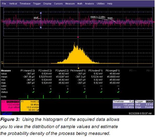 讓我們從大部分基本測量開始。Figure 2中我們做了帶寬受限噪聲波形的時(shí)域測量。通過使用測量參數(shù)取得了噪聲信號(hào)特征的一些認(rèn)識(shí)。大多數(shù)有意義的參數(shù)是波形的平均值,標(biāo)準(zhǔn)方差,峰峰值。這些測量的標(biāo)準(zhǔn)方差,可以描述為交流有效值,被看作成波形的有效值是非常有用的。參數(shù)統(tǒng)計(jì)可顯示平均值,最大值,最小值,標(biāo)準(zhǔn)方差,統(tǒng)計(jì)的測量值數(shù)量。讀出參數(shù)下的小直方圖稱為histicons,顯示了相關(guān)參數(shù)測量值的分布。