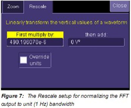 在重標(biāo)刻度后,F(xiàn)2中的FFT的垂直單位是 V2√Hz。通過對(duì)FFT跡線以下的區(qū)域積分可以確認(rèn)重標(biāo)刻度的正確性。Figure 5中用門限到用來限制噪聲源帶寬的濾波器的噪聲帶寬的區(qū)域參數(shù)來實(shí)現(xiàn),該處是280kHz。F2以下的區(qū)域是平均平方值, 32.575 E-6 V2??梢院虲2中波形的平均平方值(變量)計(jì)算所得的參數(shù)P3 32.575 E-6 V2比較。