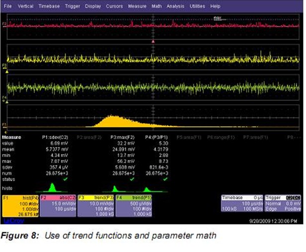 參數(shù)統(tǒng)計(jì)包括最小和最大值。如果想查看采集接著采集的參數(shù)變化可以使用趨勢功能。趨勢繪出了每個(gè)測量值vs 順序事件數(shù)的變化。Figure 8中顯示的函數(shù)跡線F4就是參數(shù)P1的趨勢。P1是通道C2的標(biāo)準(zhǔn)方差。標(biāo)準(zhǔn)方差參數(shù)每一次采集產(chǎn)生一個(gè)值,而F4順序顯示測量到的每一個(gè)讀數(shù)。趨勢圖可以看成一種任意波形,可以使用任何數(shù)學(xué)或測量工具對(duì)其分析。
