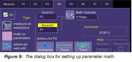 另一個(gè)關(guān)注的噪聲參數(shù)是峰值系數(shù),峰值對(duì)有效值的比率。這個(gè)決定動(dòng)態(tài)范圍的參數(shù)需要處理信號(hào)中的峰值變化。示波器沒有雙“峰”參數(shù),但可以通過采用通道 C2的絕對(duì)值從而創(chuàng)建一個(gè)。將負(fù)值“翻轉(zhuǎn)”到波形的正上方以便用戶使用參數(shù)最大值讀取每個(gè)采集最大的正或負(fù)峰值。注意該處理因?yàn)樾盘?hào)具有0平均。使用參數(shù)數(shù)學(xué)計(jì)算峰值系數(shù)。參數(shù)數(shù)學(xué)設(shè)置如Figure 9所示,計(jì)算P3對(duì)P1的峰值系數(shù)P4。Figure 8中所示峰值系數(shù)平均值為4.3。