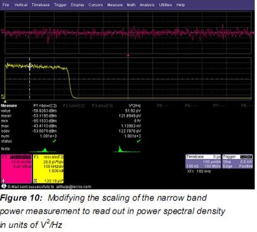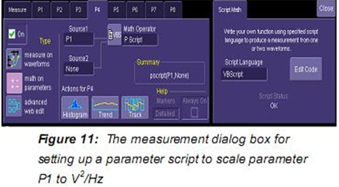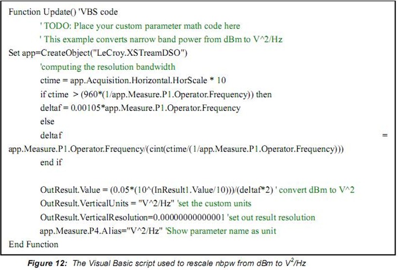 另一個(gè)進(jìn)行噪聲“點(diǎn)”測量的方法是采用可選的窄帶功率測量。窄帶功率(nbpw)通過計(jì)算給定頻率上的離散傅里葉變換測量功率。Nbpw的單位是dBm。噪聲測量不太方便,我們希望用噪聲功率譜密度線性單位V2√Hz來進(jìn)行測量。幸運(yùn)的是,力科示波器可以用腳本使用參數(shù)數(shù)學(xué)修改測量。這允許更復(fù)雜的計(jì)算而不是Figure 9所示的參數(shù)的簡單比率峰值系數(shù)。