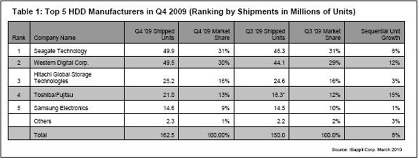 這些數(shù)據(jù)足以讓希捷2009年第四季度在硬盤出貨量和營業(yè)收入方面均繼續(xù)排名第一。