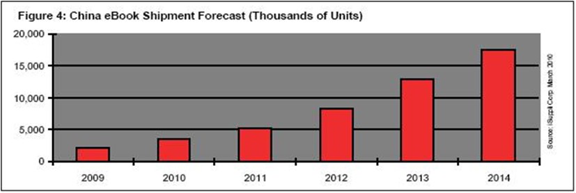 據(jù)iSuppli公司,2010年中國市場的電子書出貨量將達(dá)到360萬個(gè),比2009年的210萬大增70.7%。到2014年,中國市場的電子書出貨量將達(dá)到1760萬個(gè)。
