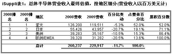 表1所示為iSuppli公司對2009年各地區半導體營業收入的最終估計。