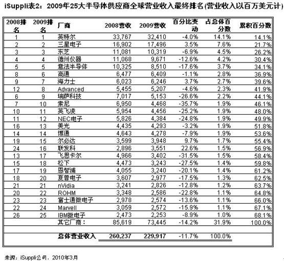 表2所示為iSuppli公司對2009年全球半導體廠商營業收入的最終排名。