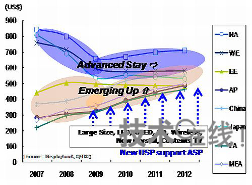 分地區(qū)看電視的平均銷售價格(ASP)變化可預(yù)測,發(fā)達(dá)國家市場的ASP暴跌將告一段落,而在新興市場國家,隨著FPD電視的增加和屏幕大型化,ASP將會繼續(xù)上漲。另外,估計LED背照燈液晶電視、3D電視、IPTV及無線功能等的普及也會成為推高ASP的因素。