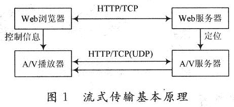 需要說(shuō)明的是,在流式傳輸中,使用RTP/UDP和RTSP/TCP兩種不同的通信協(xié)議與A/V服務(wù)器建立聯(lián)系,是為了能夠把服務(wù)器的輸出重定向到一個(gè)不同于運(yùn)行A/VHelper程序所在客戶機(jī)的目的地址。實(shí)現(xiàn)流式傳輸一般都需要專用服務(wù)器和播放器,其基本原理如圖1所示。