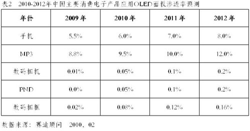 中國目前是全球最大的OLED應用市場,其中45%以上的IT產品與顯示器件有關;中國內地的手機產量占全球產量的50%以上;中國內地的MP3/MP4產量占全球產量的90%以上;而其他消費電子產品的產量占全球產量的一半以上。隨著OLED面板成本的進一步下降和產能的進一步提升,未來在其他消費電子產品的應用水平也會有所提升。