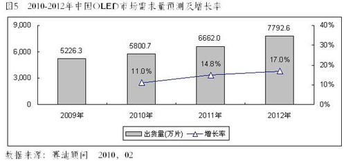 2010年4月13日,中國權威ICT研究與管理咨詢機構賽迪顧問股份有限公司在“2010中國消費電子市場年會”上發(fā)布《2009-2010年中國OLED產業(yè)發(fā)展研究年度報告》顯示:隨著手機和MP3/MP4等應用產品需求的推動,OLED顯示屏市場自2003年開始快速成長,到2009年,全球OLED出貨量達到8780萬片,由于受到全球終端產品有所減緩的影響,特別是手機和MP3市場出貨量的下滑,加上PMOLED全球產量明顯降低,但AMOLED在得到面板廠商大力推動下,特別是像諾基亞、三星、索愛等終端廠商,均在2009年推出一系列采用AMOLED屏幕的手機,在應用市場的推動下,AMOLED有了較大的增長,不過OLED總體仍有所下滑。伴隨著AMOLED出貨量的增長和市場比例的提升,OLED整體產值有明顯的增長,2009年產值達到9.05億美元,較2008年成長31.2%,出貨量在下滑的同時,而出貨額保持增長,AMOLED貢獻極為明顯。