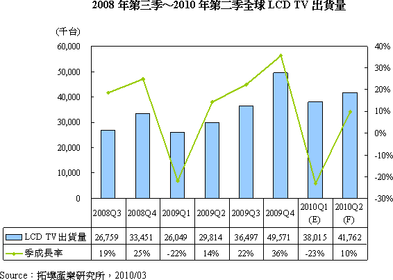 每年第一季歐美地區(qū)普遍缺乏節(jié)日刺激銷售,因此當季全球LCD TV出貨量往往呈現(xiàn)衰退狀況。雖然業(yè)界期望中國春節(jié)能改變第一季衰退的命運,但2010年春節(jié)中國市場LCD TV銷售量僅214萬臺,遠低于各界預(yù)估的400萬臺。拓墣產(chǎn)業(yè)研究所張乘維經(jīng)理估計,2010年全球LCD TV首季出貨量僅3,802萬臺,較2009年第四季下滑23%。