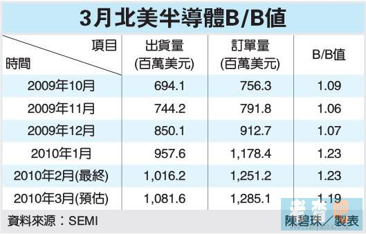 國際半導(dǎo)體設(shè)備材料產(chǎn)業(yè)協(xié)會(huì)(SEMI)公布,3月最新北美半導(dǎo)體訂單出貨比(Book-to-Bill)為1.19,較2月修正后的1.23略為下降,仍是連續(xù)第九個(gè)月超過1以上的紀(jì)錄,加上絕對(duì)訂單,與出貨金額各創(chuàng)30個(gè)月與20個(gè)月新高,顯示半導(dǎo)體景氣仍在多頭。