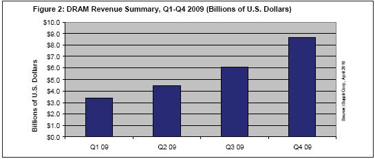 2009年第一季度創(chuàng)下2001年以來的最低營業(yè)收入,DRAM產(chǎn)業(yè)隨后持續(xù)穩(wěn)步改善,第四季度營業(yè)收入達(dá)到87億美元,比第三季度的61億美元勁增43%。這樣的結(jié)果足以使2009年第四季度成為過去10年來DRAM市場表現(xiàn)最好的五個季度之一。