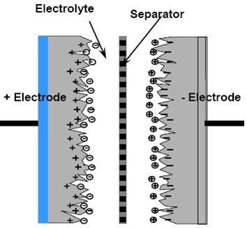 超級電容器可以被視為在兩個極板外加電壓時被電解液隔開的兩個互不相關的多孔板。對正極板施加的電勢吸引電解液中的負離子,而負面板電勢吸引正離子。這有效地創建了兩個電荷儲層,在正極板分離出一層,并在負極板分離出另外一層。