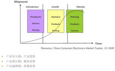 對原廠來說,市場開發策略會隨著產品的不同生命周期而發生變化。在產品導入期,產品的優勢最為突出,此時穩定產品性能和表現最重要,在產品增長期,競爭漸多,客戶的要求也開始提高,產品本身的優勢可能最多3月甚至1個月就被競爭對手追趕或超過。在產品增長期末端和產品成熟期,市場差異化的空間已經不大,上下游趨于集中,此時原廠經過激烈競爭后已經只剩幾家寡頭,市場進入拼價格的階段,這個時候,價格決定一切,原廠開始突出價格優勢。