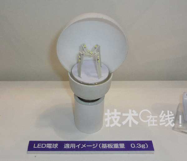 作為應用立體布線的例子,Mectron還展出了LED燈泡的試制品。通過在立體底板上封裝朝向多個方向的LED模塊,可以擴大光照射范圍。如果在布線層之外再加上散熱用厚銅箔,則LED模塊散熱也會變得很容易。
