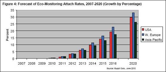 上述每類應用的汽車配售率預計都會增長,2010-2013年增長比較緩慢,隨后從2014年開始基本以兩位數的速度增長,直到2020年末。iSuppli公司的圖表顯示,節能監測和節能建議近期將大幅增長,而由于復雜性和需要與其它汽車系統整合,節能動力總成的布署比較緩慢。但到2020年,美國和西歐的節能動力總成應用將達到35%的配售率,接近節能監測和節能建議系統的水平。
