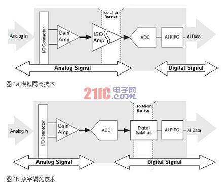 現今,許多商業(yè)現成可用(COTS)組件都含有上述隔離實現技術之一。對于模擬I/O通道,您可以在模數轉換器(ADC)完成信號的量化處理之前(模擬隔離)或之后(數字隔離)在設備的模擬部分實現隔離功能。根據您的隔離實現在電路中位置的不同,您需要依據其中的一種技術來設計不同的電路。您可以基于您的數據采集系統(tǒng)性能、成本和物理需求,選擇模擬或數字隔離技術。圖6a和6b展示了實現隔離功能的不同階段。