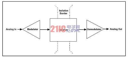 在一個理想的隔離放大器中,其模擬輸出信號與模擬輸入信號完全相同。圖7中標記為“隔離”的部分采用了之前章節(jié)中討論的技術(光耦合、電容耦合或感應耦合)之一,以跨過隔離層傳遞信號。調制器電路為隔離電路對信號進行預處理。對于光學耦合方法,您需要對該信號作量化處理,或將其轉換為變化的光強。對于電容耦合方法和感應耦合方法,您需要將該信號轉換為變化的電場或磁場。然后,解調器電路讀入隔離電路的輸出,并將其轉化回最初的模擬信號。